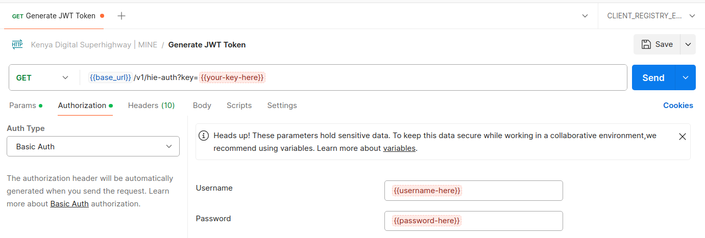 Before you can request a JWT token, you need to set up Basic Authentication using your HIE account credentials. You'll need to register for an account in the HIE Developer Portal to receive your API username and password.